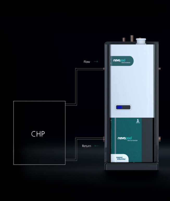 In the summertime CHP’s have difficulty in losing thermal heat, which results in the units switching off. We can connect the CHP (size dependant) to the NovaPod™ Transformer to allow heat dissipation to be utilised by domestic hot water and the heating load.