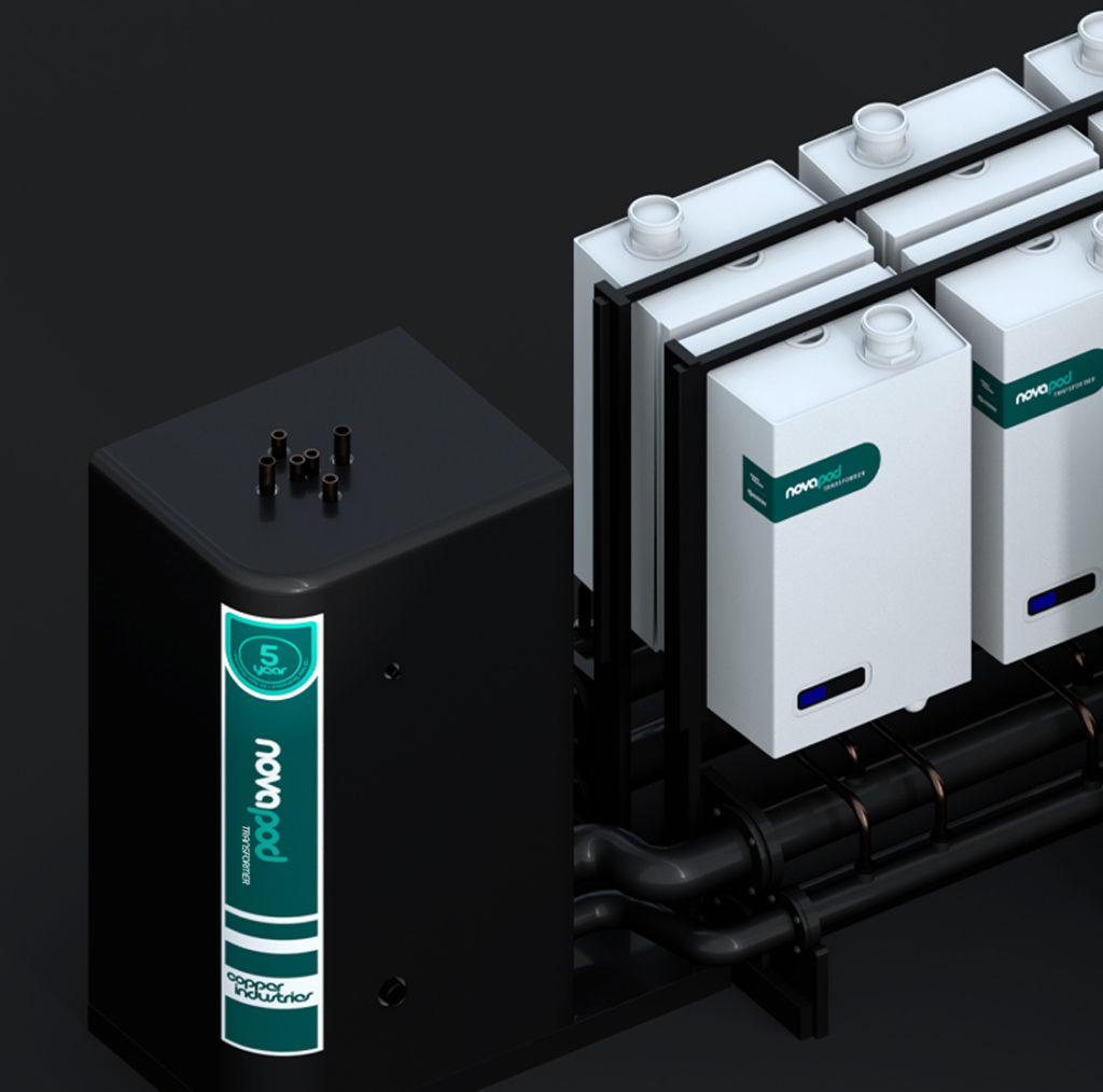 We can tailor the NovaPod™ Transformer to meet a variety of demands with resilience inherently built in. The boiler uses the NovaPod™ Transformer unit as the hydraulic balancer between the boiler water flow rate required to meet the modulated demand at any time, and the system flow rate, which will be different to the boiler due to different controls from the Boiler Management System.